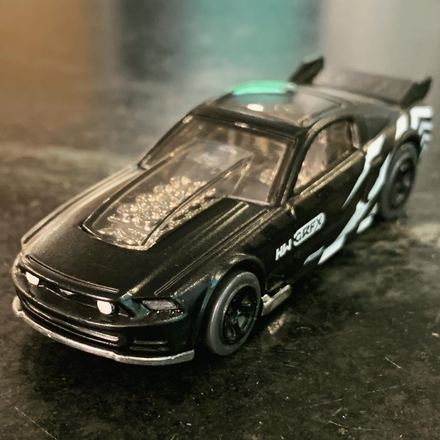 Black 2013 Drag Ford Mustang - Hot Wheels Customization | 2022 Diecast and Plastic - 1/64 Scale - Painted: Panel Lines, Head Lights, Fog Lights, Tail Lights, Turn Signals, Mustang Logo, Drag Bar Extender, and Underside Details - Collection of the Artist