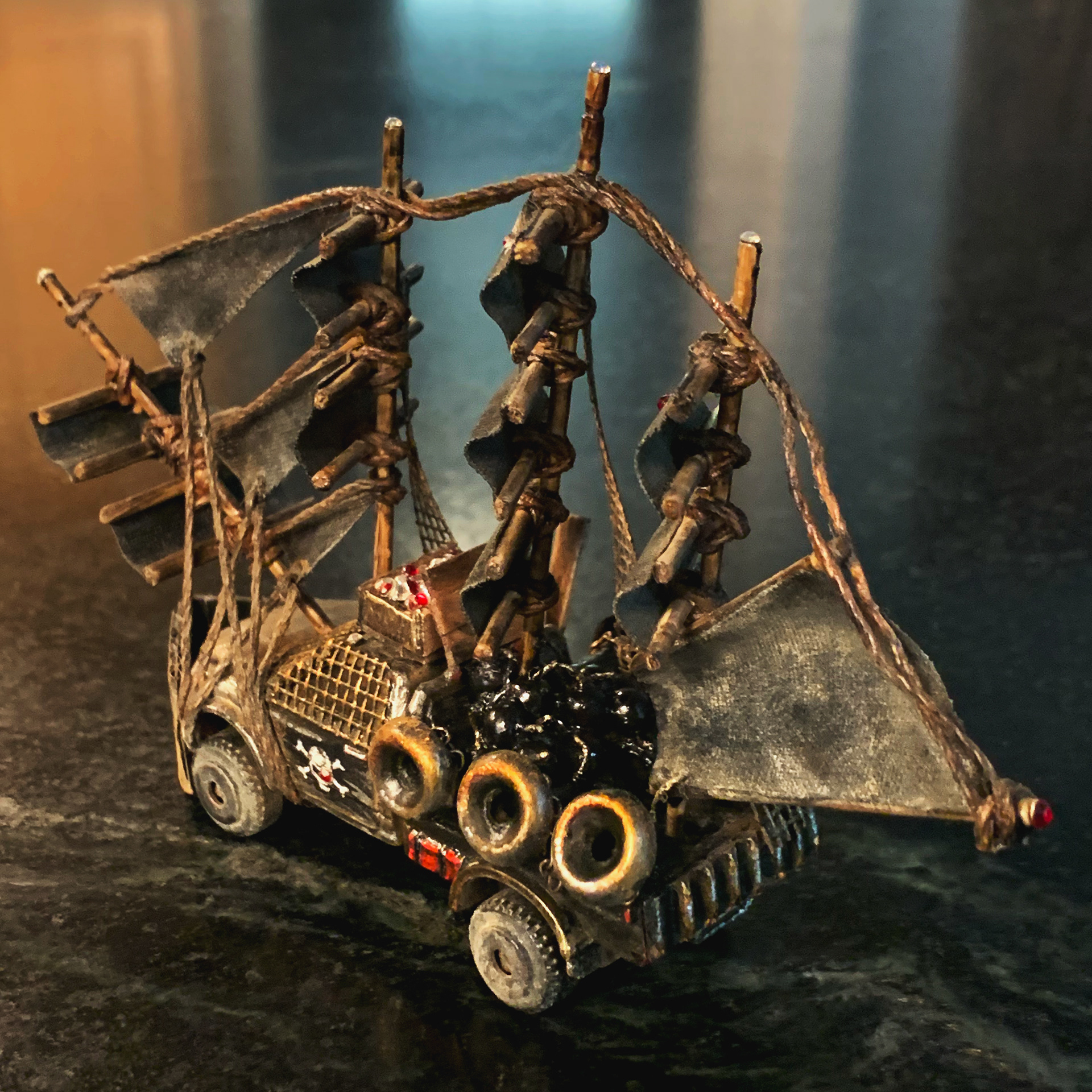 Gaslands Folly Dodger (2016 Ram Flatbed) - Matchbox Custom | 2024 Diecast and Plastic - 1/64 Scale - Added: Filed Down for Metal, 6 Cannons, Pile of Cannon Balls, Cannon Hold Downs, Window Mesh, Steel Plow, Steel Back Bumper, Wheel Armor, 13 Sails, Sail Rigging, Sail Posts, Sail Skull and Bones with Rubies, Climbing Nets, Treasure Box, Treasure, Trail Lights, Tail Lights, Plank, Post End Lights - Supplies: Hobby Rhinestones, Hobby Pearls, Fabric, Toothpicks, Flat Washers, Rounded Washers, Polystyrene Tubes, Necklace String, Plastic Door Mesh, Corrugated Card, Wood Beads, Chain, Balsa Wood - Painted: Body, Window Mesh, Steel Bumpers, Wheel Armor, Tires, Gas Tanks, Sails, Sail Posts, Sail Rigging, Climbing Mesh, Cannons, Cannon Balls, Plank, Treasure Box, Chains - Collection of the Artist